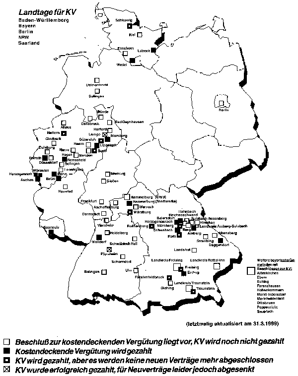 KV wird derzeit (31.3.1999) von 33 EVUs gezahlt, in 55 liegt der Beschluß vor, die KV wird jedoch noch nicht gezahlt.[15]