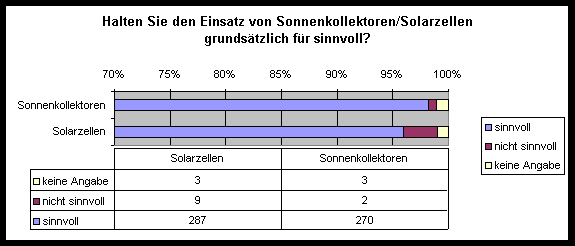 Bei allen Akzeptanzproblemen bezüglich der Solaranlagen besteht weitgehend Einigkeit darüber, daß der Einsatz von Solaranlagen sinnvoll ist. Trotz dieses einhelligen Votums für die Solarenergie gehören Solaranlagen immer noch zu einem seltenen Bild in der Landschaft. Gewertet werden in der Umfrage nur die Antworten von Personen, denen die jeweilige Technologie bekannt ist.