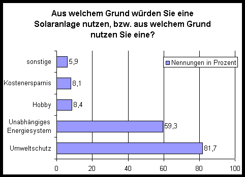 Zuerst scheint mir eine Betrachtung sinnvoll, aus welcher Motivation heraus eine Person zum Anlagenbesitzer wird, bzw. aus welchem Grund er sich vorstellen könnte, eine solche zu nutzen. Fragt man also nach den Gründen, die aus der Sicht des Verbrauchers für die Nutzung einer Solaranlage sprechen, wird an erster Stelle der Umweltschutz genannt. Von den Personen, denen die Technik von Photovoltaik und/oder Solarthermie bekannt ist, geben 81,7% den Umweltschutz für die Nutzung einer Solaranlage an. Weitere wichtige Gründe liegen in der Unabhängigkeit des Energiesystems (59,3%) und in der Hoffnung auf eine langfristige Kostenersparnis.
