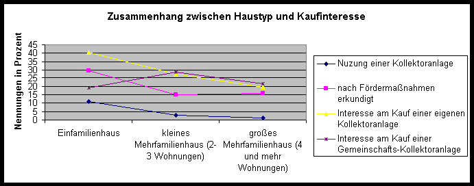 In kleinen Mehrfamilienhäusern bis zu drei Wohnungen sinkt der Wert derer, die eine solarthermische Anlage nutzen, auf 3% und bei Mehrfamilienhäusern mit vier und mehr Wohnungen sogar auf 1,1%. Auffällig ist die hohe Korrelation zwischen der Nutzung einer Kollektoranlage und dem Interesse am Kauf einer Anlage bezogen auf die verschiedenen Haustypen mit einem Korrelationskoeffizienten von r = 0,98. (Ohne Berücksichtung der Antworten aus dem sogar Internet 0,999) Aufgrund der wenigen Wertepaare (nur 3) darf diese Korrelation aber auf keinen Fall überbewertet werden. Sie zeigt jedoch, daß der Haustyp bei der Realisierung des Kaufinteresses keine ausschlaggebende Rolle spielt. Daraus ergibt sich wiederum, daß bei Mehrfamilienhäusern durch die nur wenigen installierten Kollektoranlagen ein hohes Ausbaupotential besteht. Eine gezielte Werbung, die Mehrfamilienhäuser anspricht, kann also hier den Markt wesentlich beleben. Die Abbildung zeigt weiter, daß in kleinen Mehrfamilienhäusern verstärkt Interesse für den Kauf einer Gemeinschaftsanlage besteht, was obiger Argumentation zugute kommt. Ein mögliches Handicap, dem die Bewohner in Mehrfamilienhäusern ausgesetzt sind, ist die Tatsache, daß sie erstens Rücksicht auf die anderen Bewohner nehmen müssen und zweitens, sofern sie Mieter sind, nicht alleine entscheiden können. Bei einer Gemeinschaftsanlage sind auch positive Interessen der anderen Bewohner vonnöten, bei Mietverhältnissen muß der Vermieter mitspielen.