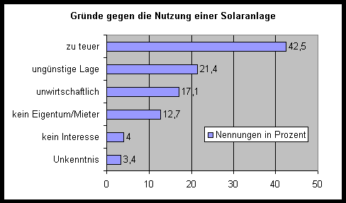 Ein großes Handicap bei der Nutzung einer Solaranlage kann eine ungünstige Lage sein. Dazu lassen sich zählen: geringe Anzahl von Sonnenstunden, geringe Strahlungsintensität, West-Ausrichtung oder in Tallagen eine starke Abschattung. In diesen Fällen muß auf jeden Fall mit Simulationsprogrammen geprüft werden, ob sich eine Solaranlage überhaupt rentiert, oder ob beispielsweise eine verstärkte Wärmedämmung nicht sinnvoller wäre. Die eigene Lage wird jedoch nicht immer richtig eingeschätzt. In der Umfrage geben 21,4% der Befragten, denen photovoltaische Anlagen und/oder solarthermische Anlagen bekannt sind, eine ungünstige Lage als Grund gegen die Nutzung einer Solaranlage an. Erstaunlich ist, daß davon 20% einen günstigen Wohnort angeben; mitten in der Oberrheinebene z.T. mit einer Ausrichtung nach Süden. Die breitengradabhängig schlechtere Situation kann bei solarthermischen Anlagen leicht durch eine größere Kollektorfläche und einen größeren Speicher ausgeglichen werden. Die Europäische Solarindustrievereinigung (ESIF) gibt in einem Vergleich zwischen Süd-, Mittel- und Nordeuropa folgende typische Werte für Dimension, Wärmeertrag und Kosten von Solaranlagen an: