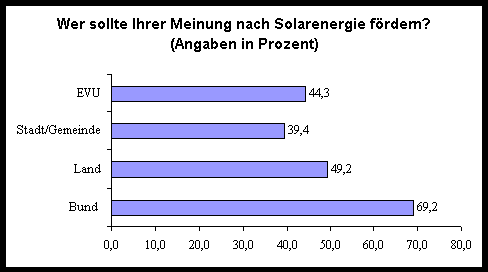 Als letzter Punkt müssen noch einmal Förderprogramme angesprochen werden. In der Untersuchung des Forums für Zukunftsenergien geben die Besitzer von solarthermischen Anlagen, wenn sie nach dem Ereignis gefragt werden, welches sie zu ihrer Investition veranlaßt hat, überwiegend die Förderprogramme an.[9] Die Qualität der verfügbaren Informationen über Förderprogramme beurteilen Sie bei solarthermischen Anlagen auf einer Skala von 1 (sehr gut) bis 5 (mangelhaft) mit 3,5[10], bei photovoltaischen Anlagen dagegen mit 2,5.[11] Es wurde schon angesprochen, das die Photovoltaik einer höheren Förderung bedarf. Mit dem 100.000-Dächer-Programm dürfte heute die Qualität der verfügbaren Information über Förderungen für PV-Anlagen noch positiver beurteilt werden. Insgesamt läßt sich das Ergebnis dieser Studie jedoch nicht auf die gesamte Bevölkerung übertragen; Informationen über Förderprogramme werden in der Regel erst bei der Planung einer Anlage eingeholt. Folgende Abbildung zeigt, wer aus der Sicht der Bevölkerung Solarenergie fördern sollte: